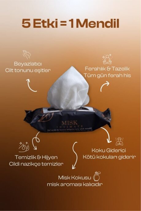Misk kokulu MISK İntim Temizleme Mendili; hassas bölgede temizlik, ferahlık, koku giderme ve ton eşitleme etkisini bir arada sunan alkolsüz, parabensiz bitkisel formüllüdür.