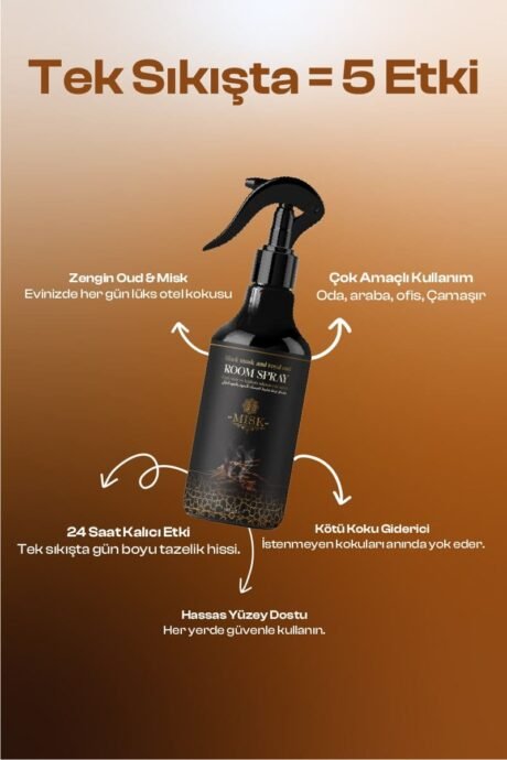 MISK Miskli Zengin Oud Oda ve Araba Spreyi; zengin oud ve misk aromasıyla ev, araba ve ofis ortamlarını anında ferahlatır, kötü kokuları giderir ve uzun süre kalıcı lüks bir koku bırakır.