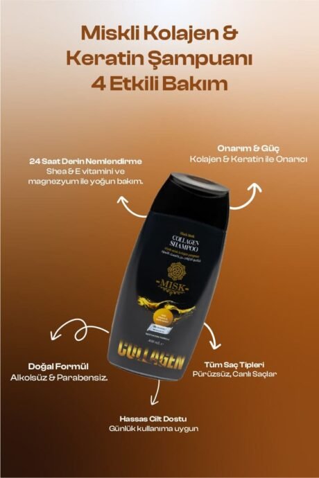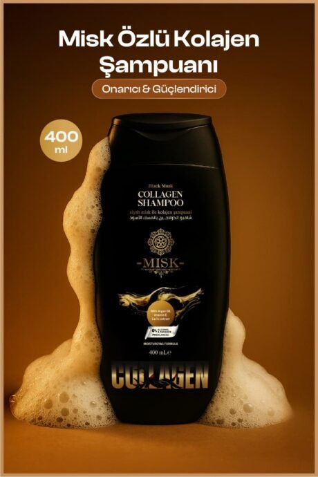 %100 Doğal MISK Kolajen Şampuan – saçları güçlendiren kolajen desteği ve uzun süre kalıcı siyah misk aromasıyla günlük kullanıma uygun bakım sunar.