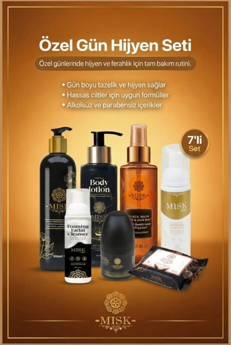 MISK Özel Gün Hijyen Seti, regl ve özel günlerde ihtiyaç duyduğunuz tüm bakımı tek sette toplar. İntim hijyen, duş, cilt ve vücut bakımını bir arada sunan 7’li özel gün hijyen seti; alkolsüz, parabensiz ve hassas ciltlere uygun formülleriyle gün boyu ferahlık ve temizlik sağlar.