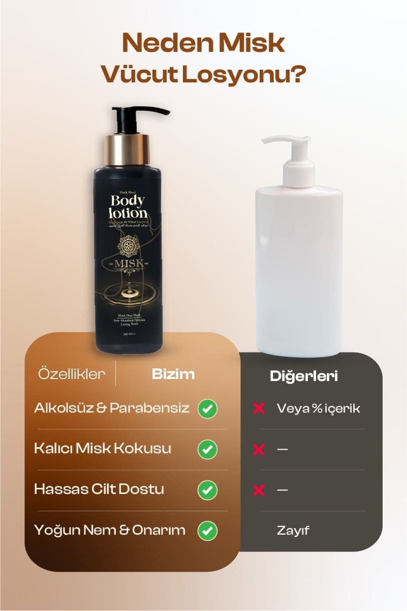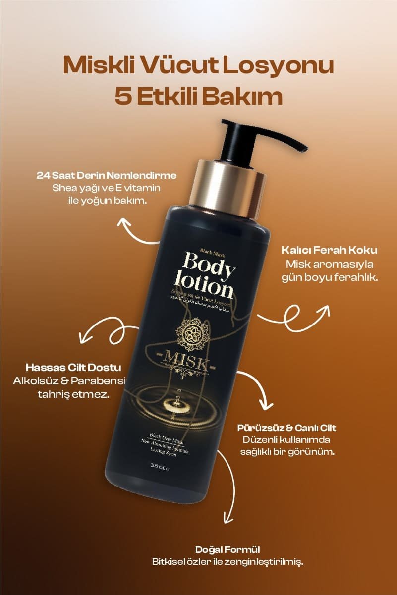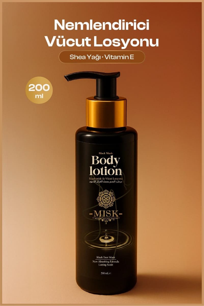 MISK Nemlendirici Vücut Losyonu, cildinizi derinlemesine beslemek ve gün boyu ipeksi bir yumuşaklık sağlamak için geliştirilmiş %100 doğal ve bitkisel içerikli bir formüle sahiptir. Shea yağı ve E vitamini ile zenginleştirilen yapısı, cildin doğal nem dengesini korurken kuruluğu önler. Alkolsüz ve parabensiz olması sayesinde hassas ciltlerde bile güvenle kullanılabilir. Özel siyah misk aroması her kullanımda ferah ve kalıcı bir esans bırakır.