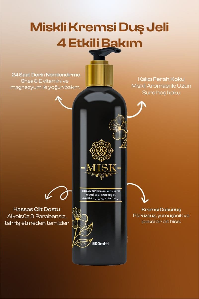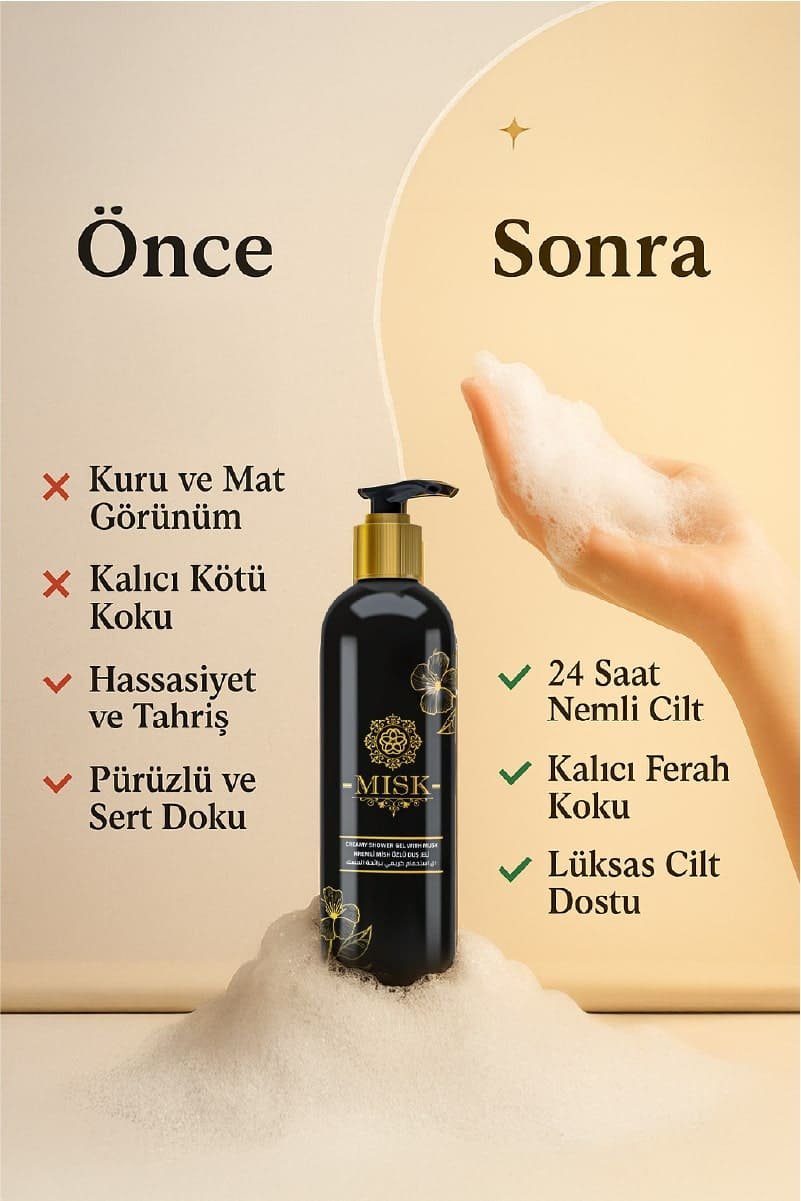 MISK Kremsi Duş Jeli, banyonuzu lüks bir bakım anına dönüştüren yoğun besleyici bir formüle sahiptir. Shea yağı, E vitamini ve magnezyum ile zenginleştirilmiş kremsi dokusu, cildi derinlemesine nemlendirir ve doğal bariyerini güçlendirir. Nazik temizleme etkisi sayesinde kuruluk hissini önler ve cilde ipeksi bir yumuşaklık kazandırır. Kalıcı siyah misk aroması, her kullanımda ferahlık ve sofistike bir koku deneyimi sunar.