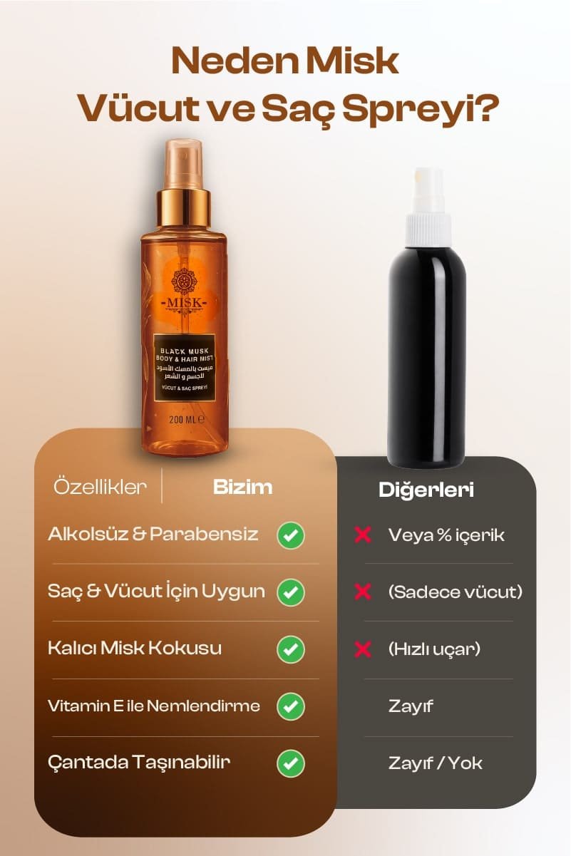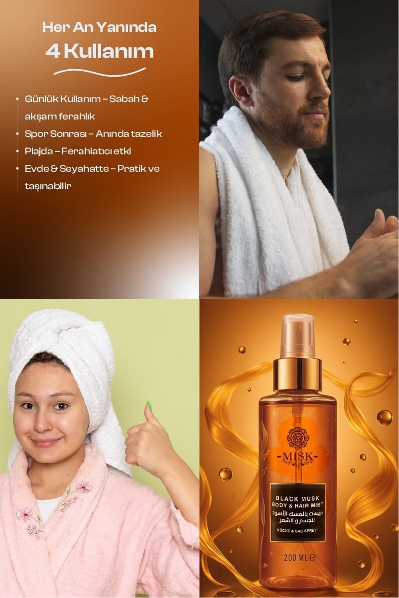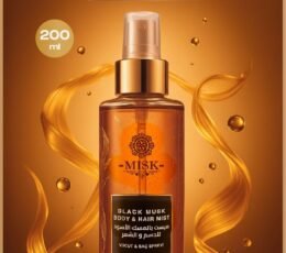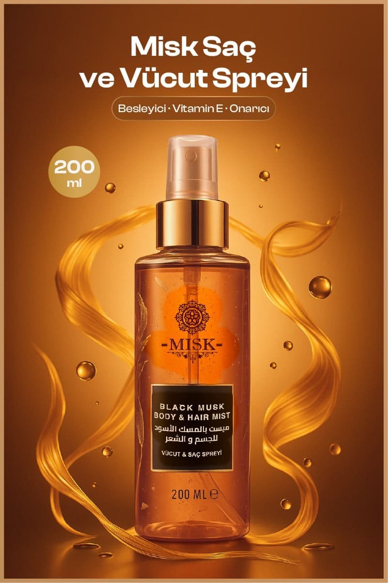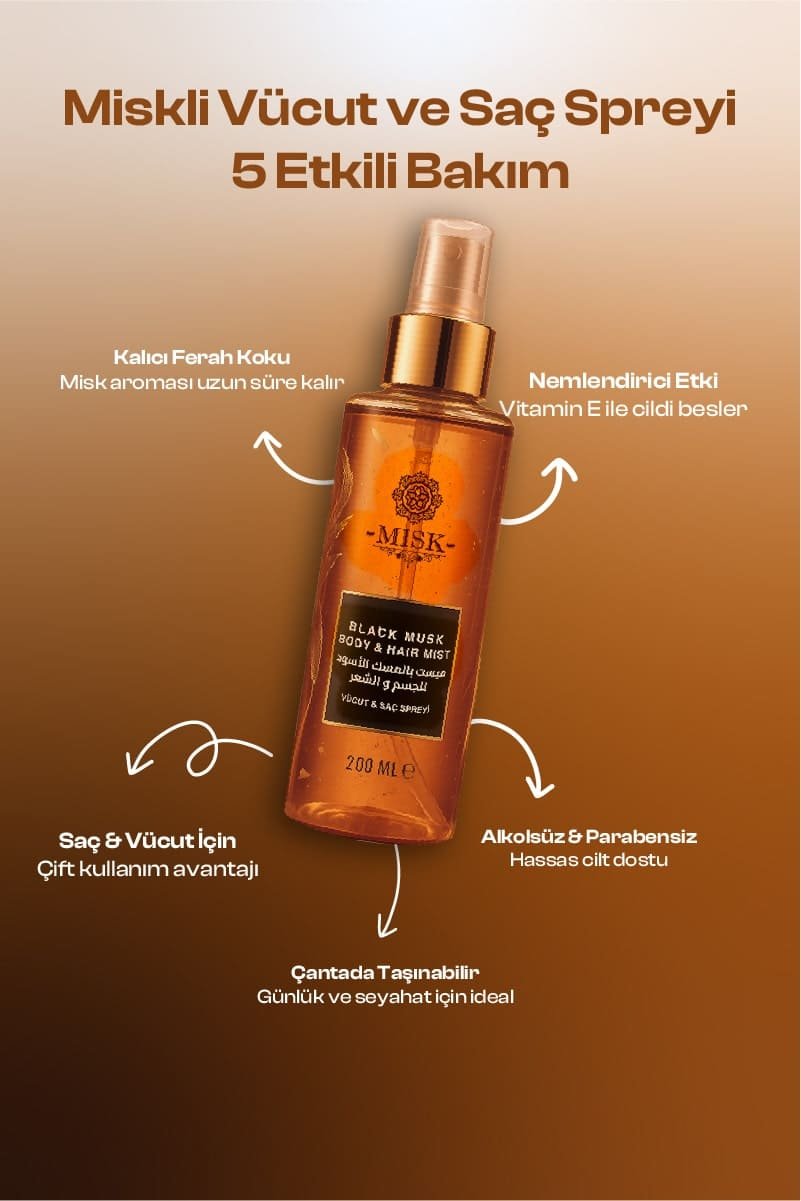 MISK Body & Hair Mist, siyah misk kokusunun büyüleyici etkisini saç ve vücudunuza taşıyan hafif ve premium bir spreydir. E vitamini ile zenginleştirilmiş formülü, cildi ve saçları beslerken gün boyu kalıcı bir ferahlık ve tazelik sunar. Alkolsüz yapısı sayesinde hassas ciltler tarafından güvenle kullanılabilir.