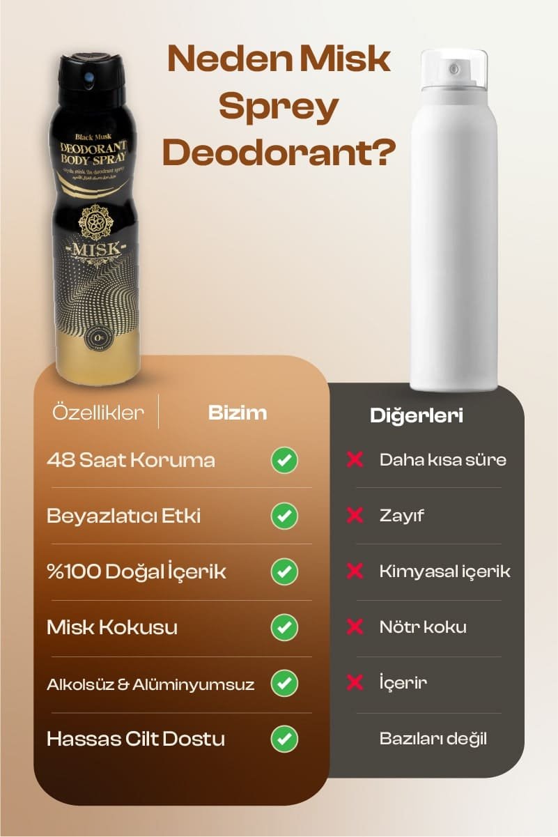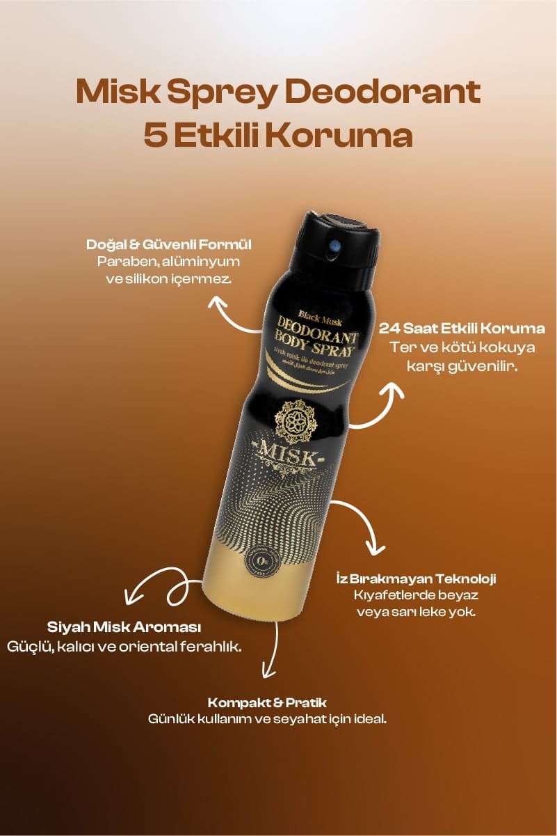 Misk sprey deodorant, gün boyu kalıcı ferahlık ve doğal misk aromasıyla etkili koku kontrolü sağlayan 150 ml premium bakım formülüdür. Ter kokusuna karşı anında etki gösterirken cildi kurutmayan nazik yapısıyla hem kadınlar hem erkekler tarafından güvenle kullanılabilir. Hafif formülü sayesinde kıyafetlerde iz bırakmaz ve günlük kullanım için idealdir.